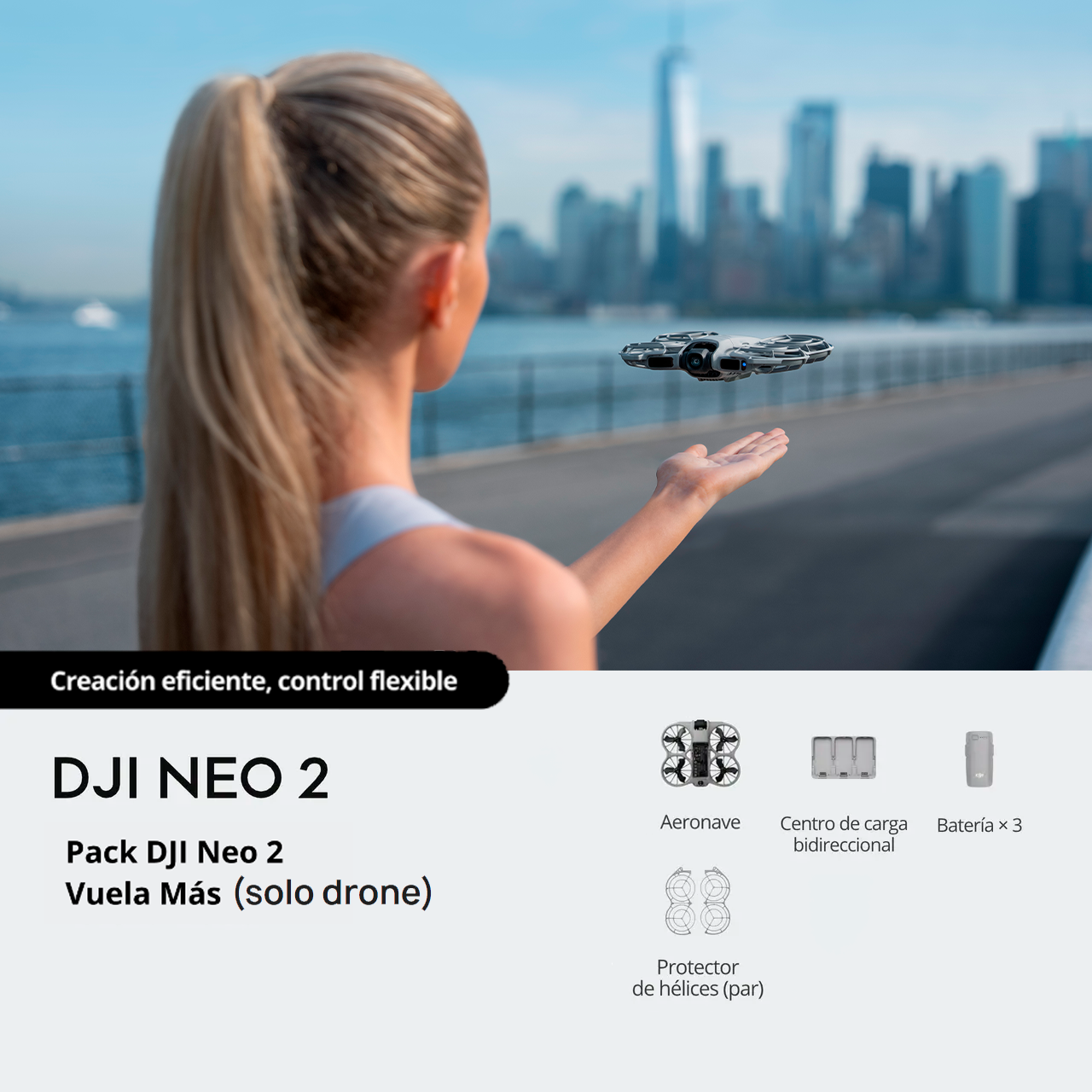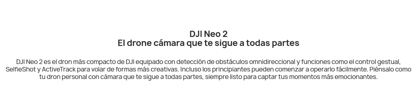 ** Medido después de activar DJI Neo 2, con una batería completamente cargada y la configuración predeterminada, usando los modos Órbita, Cohete y Dronie, y es solo de referencia.